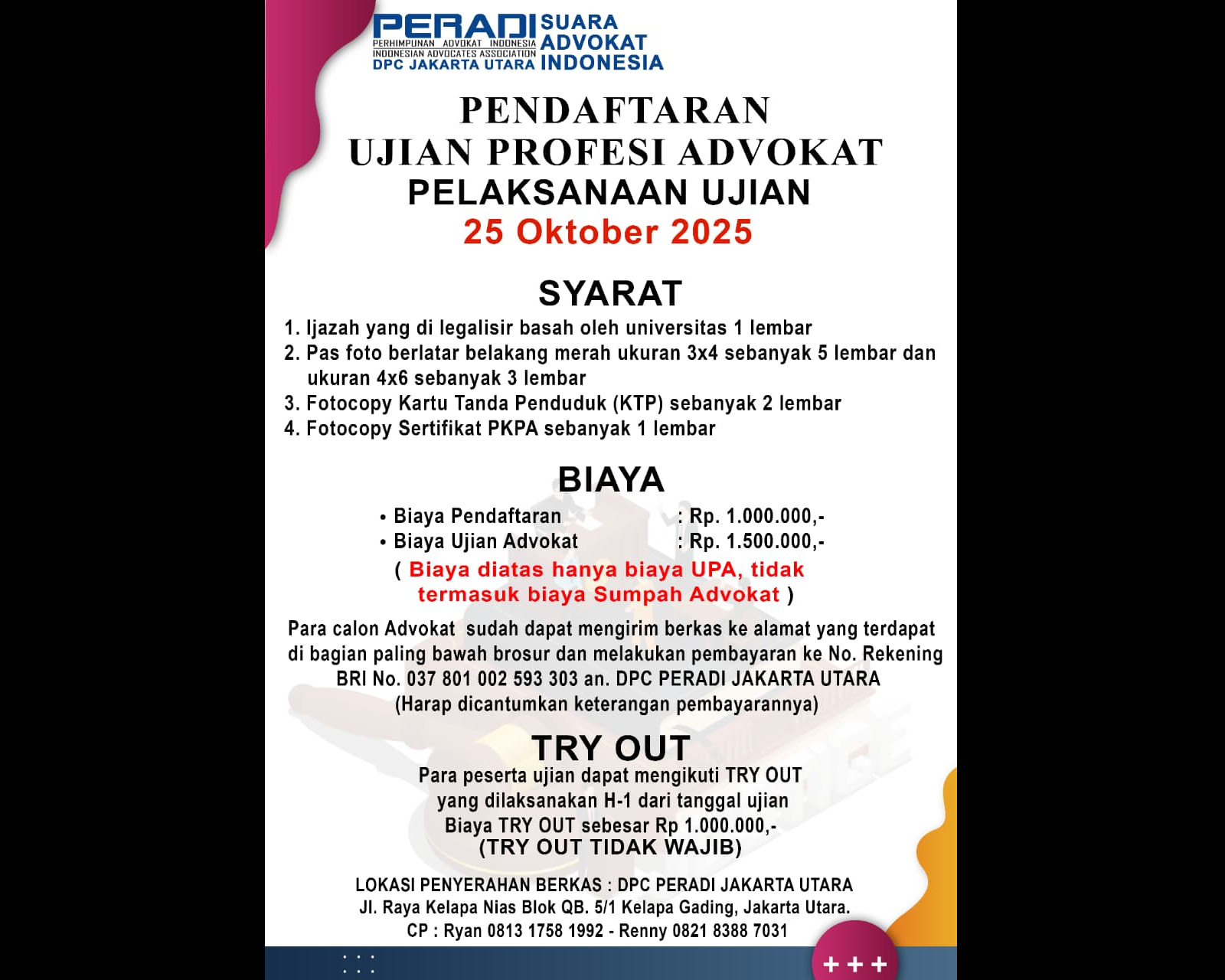 PERADI - 02 Oct 2025Pelaksanaan Ujian : 25 Oktober 2025
