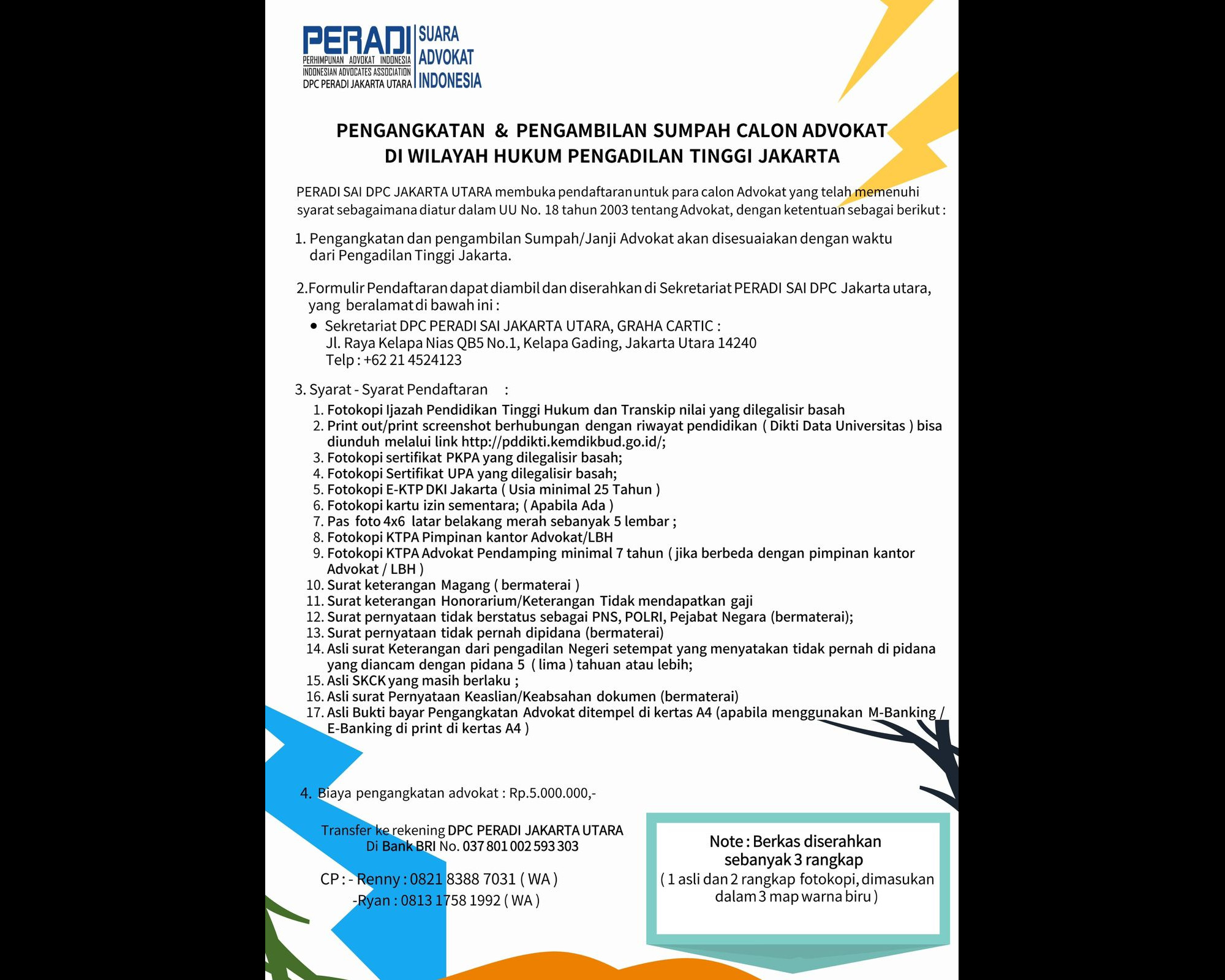 PERADI SAI JAKARTA UTARA membuka pendaftaran untuk para calon advokat yang telah memenuhi syarat sebagaimana diatur dalam UU No. 18 tahun 2003 tentang advokat, dengan ketentuan sebagai berikut :