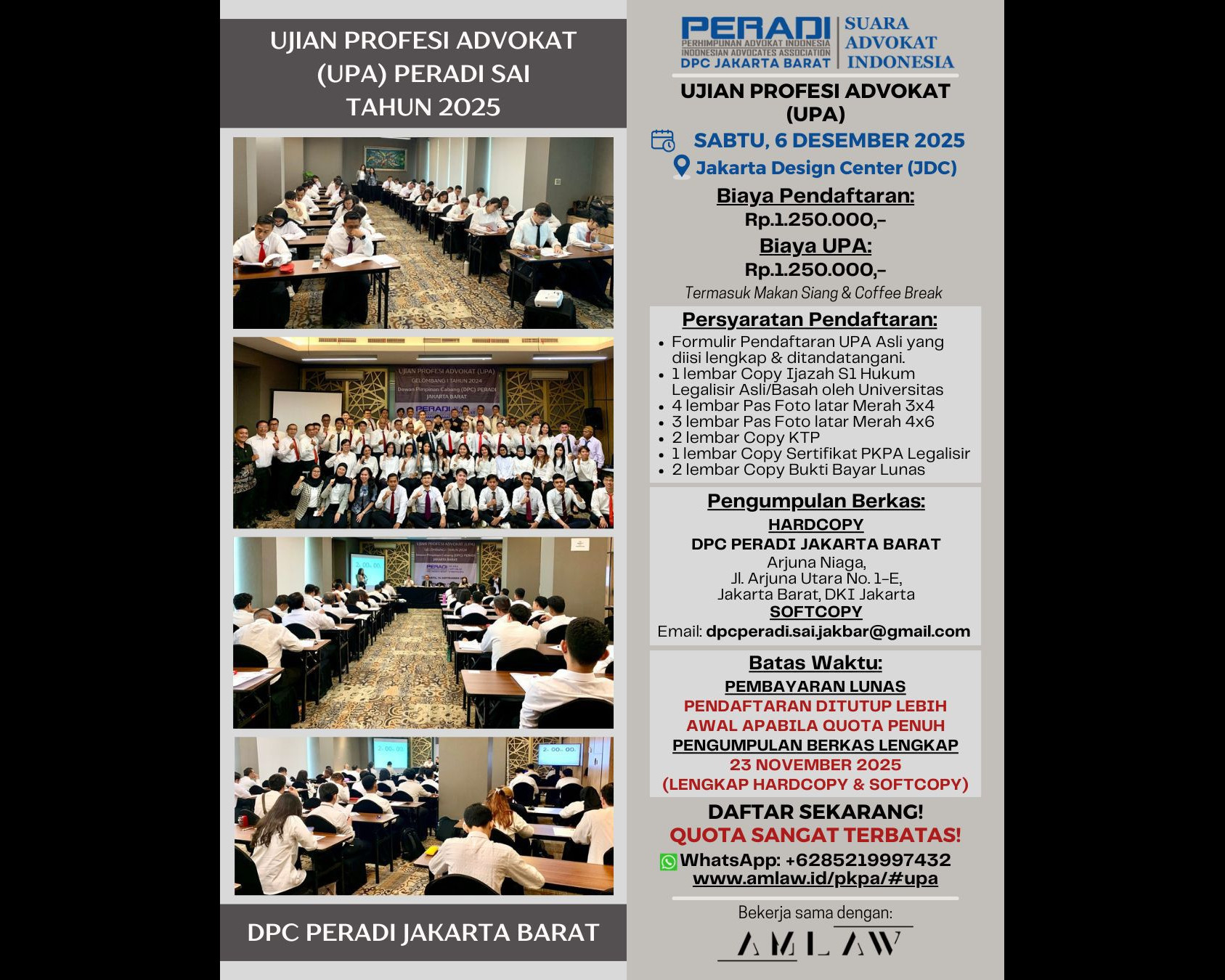 PERADI - 12 Nov 2025Telah dibuka Pendaftaran Ujian Profesi Advokat (UPA) tahun 2025, DPC PERADI Jakarta Barat dan Bekerja sama dengan AMLAW: