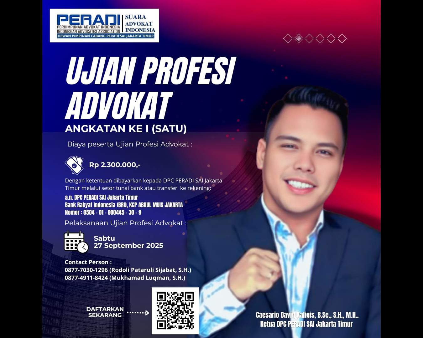 PERADI - 17 Sep 2025DPC PERADI SAI Jakarta Timur Telah Membuka Pendaftaran Ujian Profesi Advokat (UPA) Angkatan I 2025.