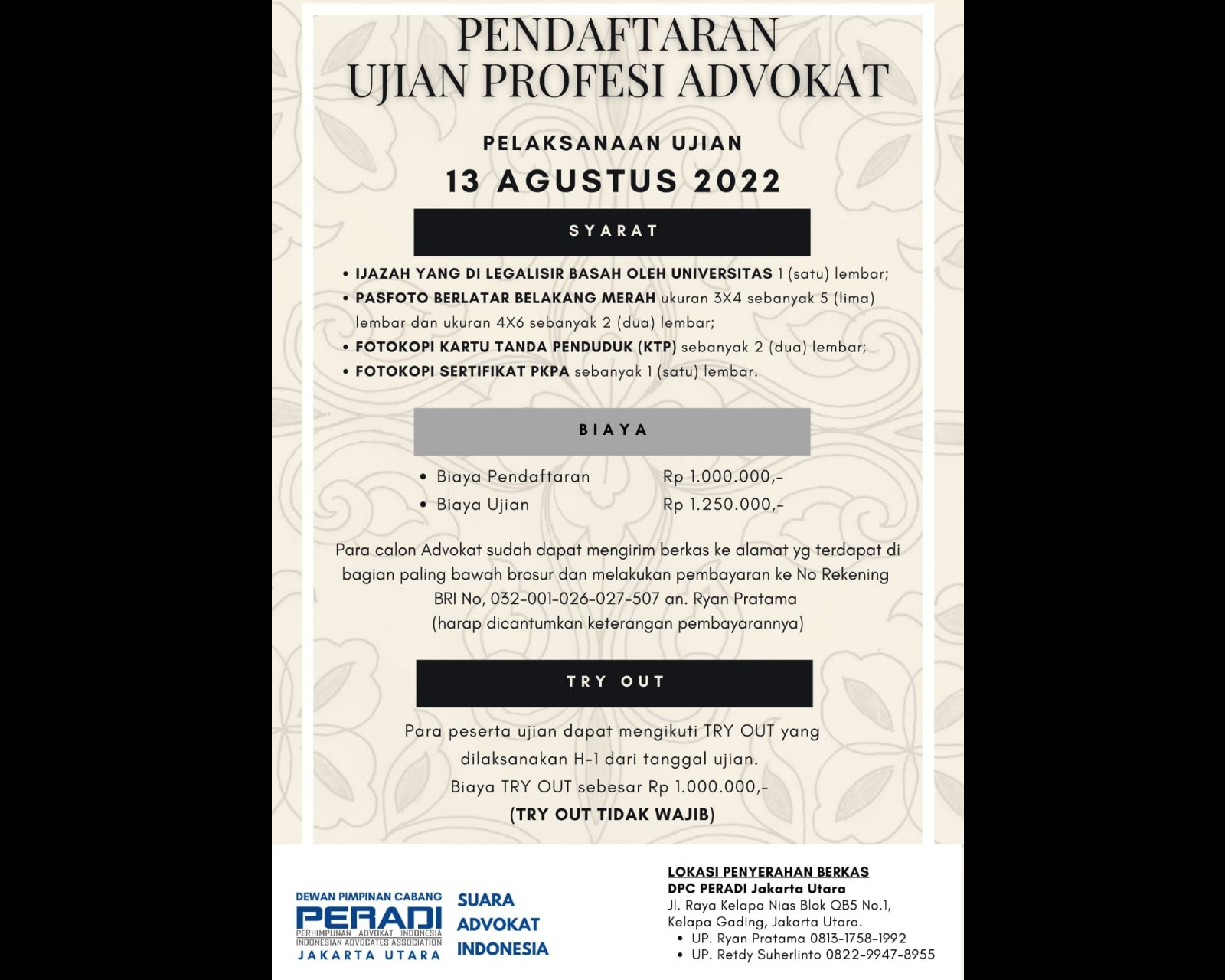 Para calon Advokat sudah dapat mengirim berkas ke alamat yang terdapat di bagian paling bawah brosur dan melakukan pembayaran ke No. Rekening